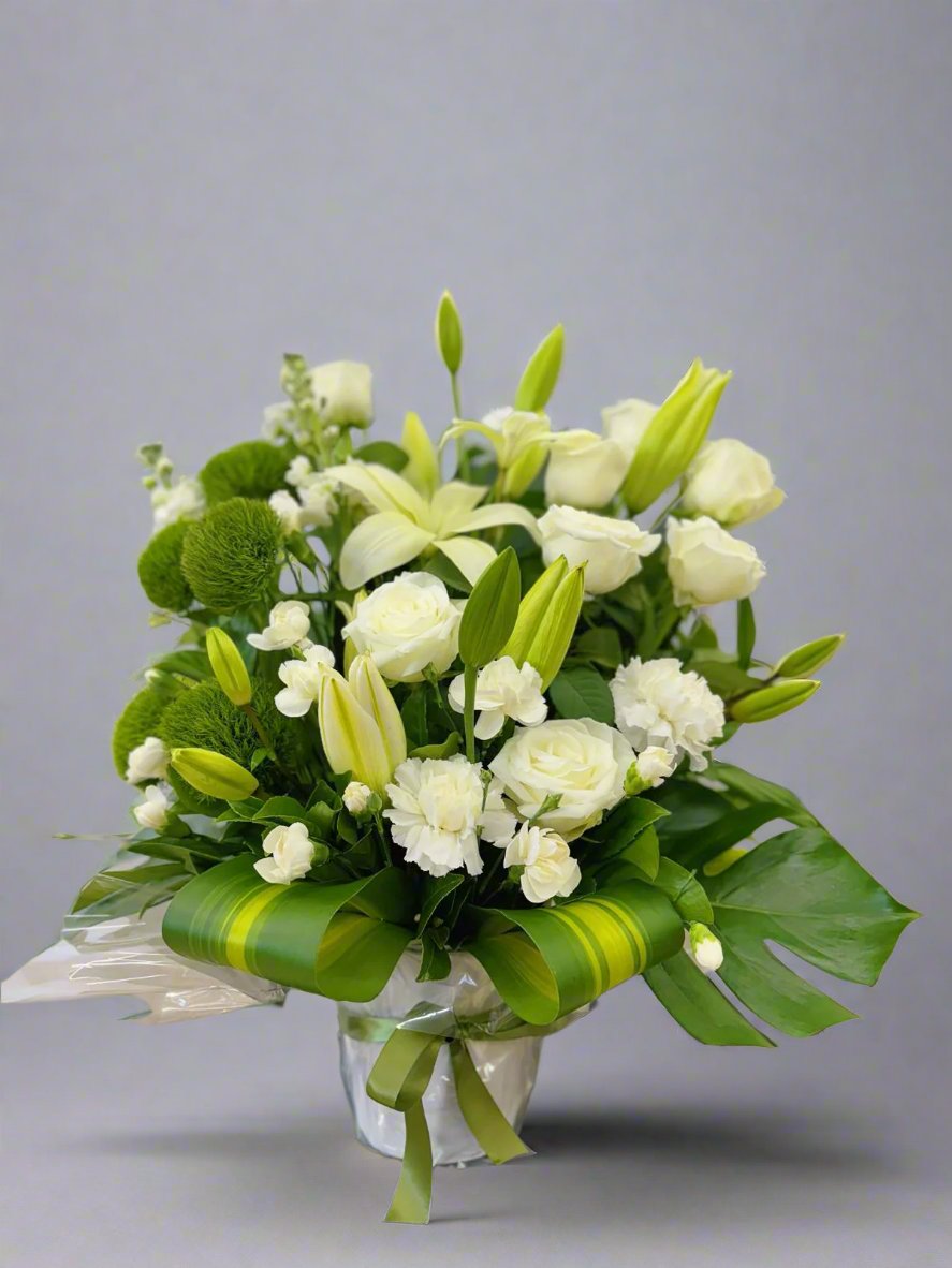 This Lush White Arrangement is expertly crafted to add elegance to any space. With its delicate white flowers and lush greenery, this arrangement will bring a sense of freshness and sophistication to your home or office. Perfect for adding a touch of beauty to any room, this arrangement is sure to impress.