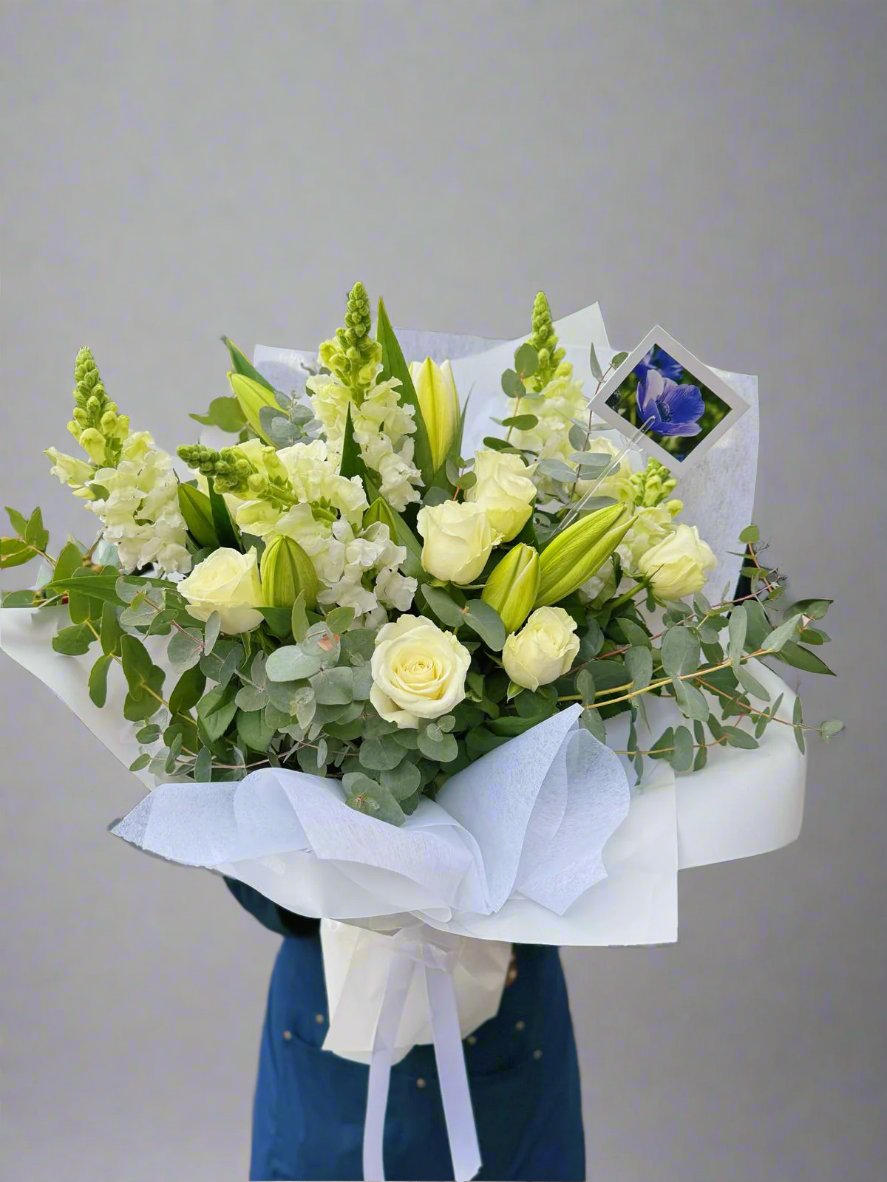 This stunning Snow White Bouquet features snow white flowers that exude elegance and purity. Handcrafted with precision and care, this bouquet will add a touch of sophistication to any occasion. With its timeless beauty, it's sure to impress and leave a lasting impression. Perfect as a gift or for adding a touch of luxury to your own home.